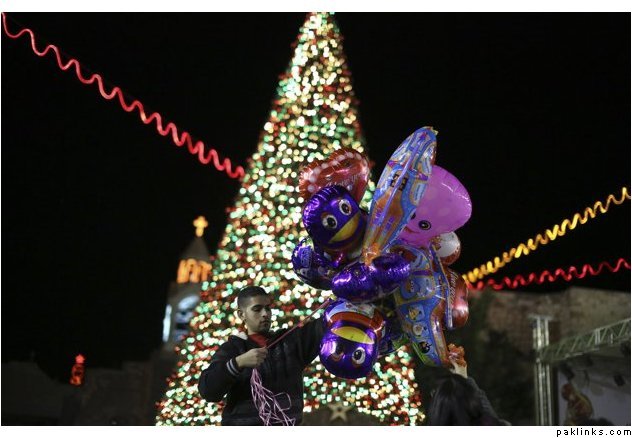 A balloon vendor stands in front of a Christmas tree after it was lit during a ceremony outside the Church of Nativity in the West Bank town of Bethlehem December 15, 2012