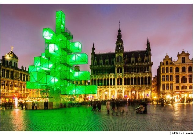 An abstract light installation replaces the traditional Christmas tree at the Grand Place in Brussels, Saturday Dec. 1, 2012. Traditionally, a 20m (65ft) pine tree from the forests of the Ardennes decorates the city’s central square, the Grand Place. This year, it has been replaced with a 25m (82ft) construction.