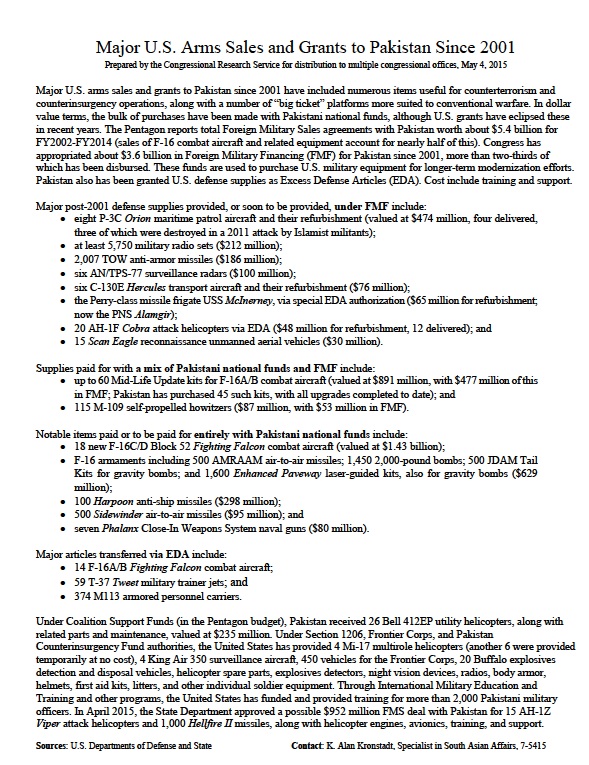 Here is a detailed sheet of information about Foreign Military Sales to Pakistan and the Coalition Support Fund since 2001. Funding and sales are two different types of support we provide. The description of the Coalition Support Fund is at the bottom. There are a mix of sales and grants to support counter-terrorism efforts and counterinsurgency operations of the Pakistani military in the country.