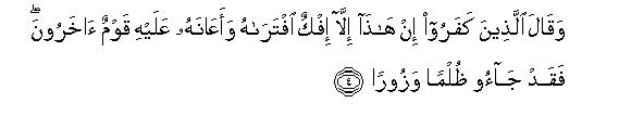 And those who disbelieve say, “This [Qur’an] is not except a falsehood he invented, and another people assisted him in it.” But they have committed an injustice and a lie.