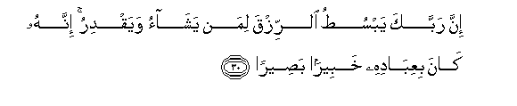 Indeed, your Lord extends provision for whom He wills and restricts [it]. Indeed He is ever, concerning His servants, Acquainted and Seeing.*(30)And do not kill your children for fear of poverty. We provide for them and for you. Indeed, their killing is ever a great sin.(31)