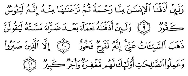 **And if We give man a taste of mercy from Us and then We withdraw it from him, indeed, he is despairing and ungrateful. (9) But if We give him a taste of favor after hardship has touched him, he will surely say, “Bad times have left me.” Indeed, he is exultant and boastful - (10) **Except for those who are patient and do righteous deeds; those will have forgiveness and great reward. (11) Surah Hud