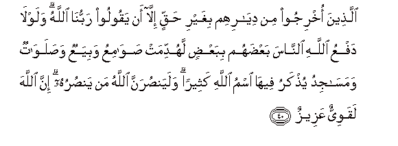 (They are) those who have been expelled from their homes in defiance of right,- (for no cause) except that they say, “our Lord is Allah”. Did not Allah check one set of people by means of another, there would surely have been pulled down monasteries, churches, synagogues, and mosques, in which the name of Allah is commemorated in abundant measure. Allah will certainly aid those who aid his (cause);- for verily Allah is full of Strength, Exalted in Might, (able to enforce His Will).