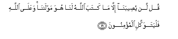 Say, “Never will we be struck except by what Allah has decreed for us; He is our protector.” And upon Allah let the believers rely. (51)