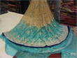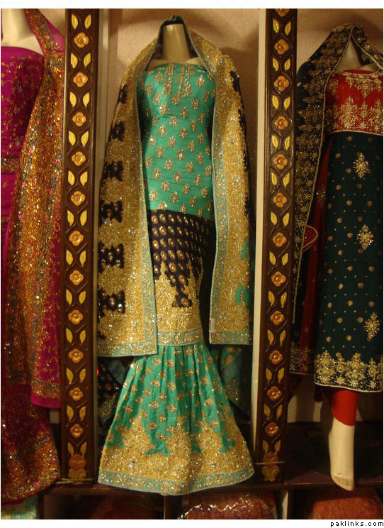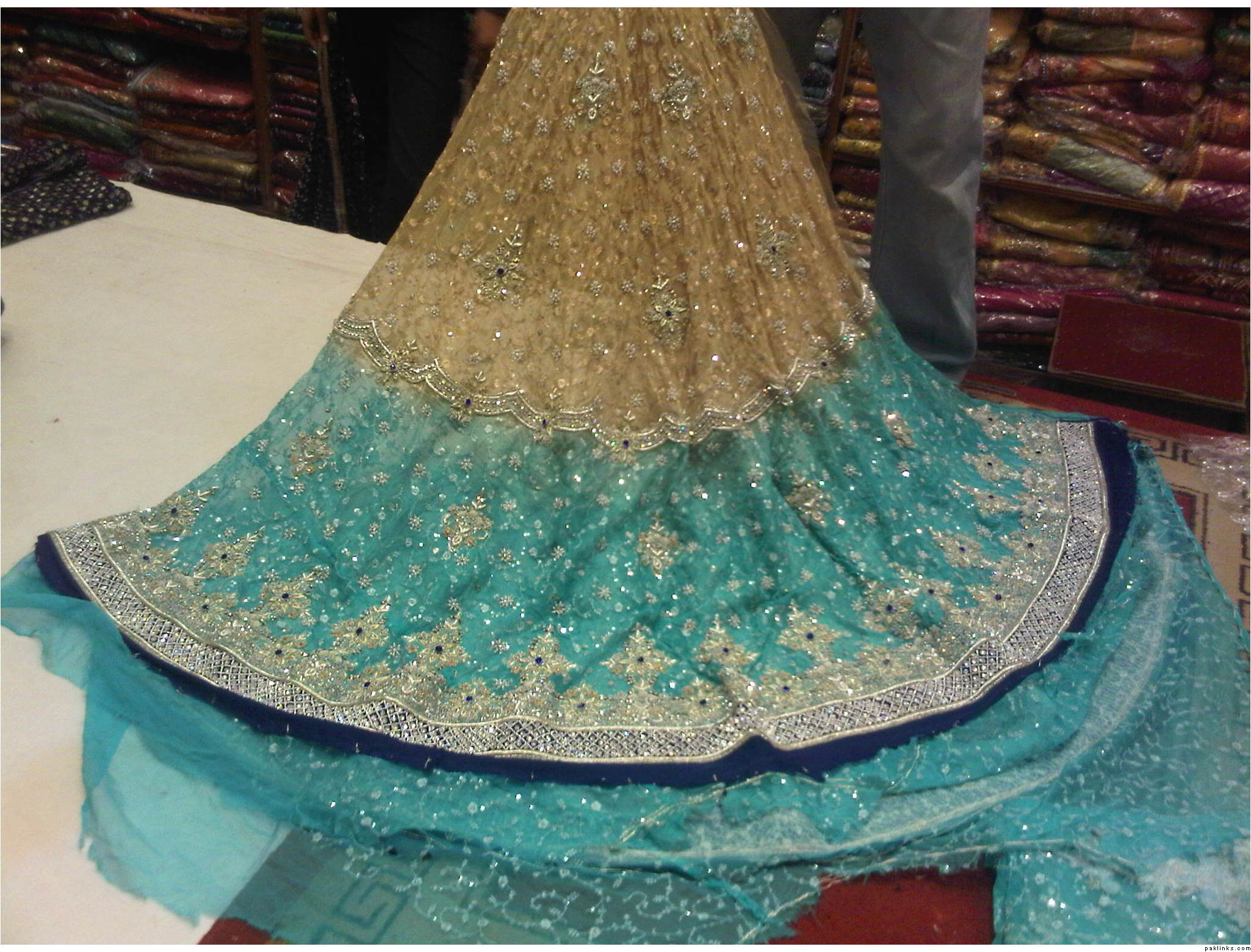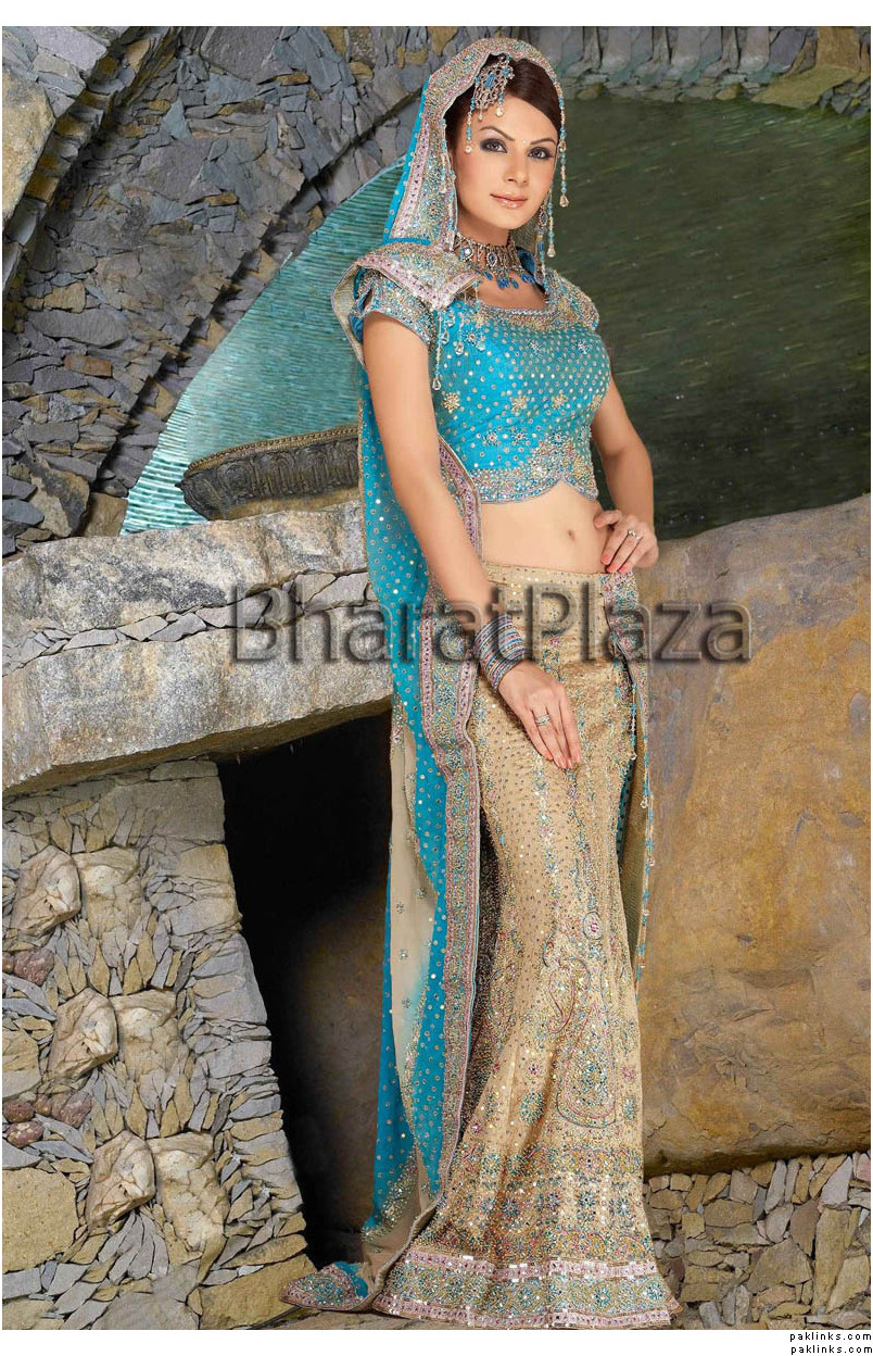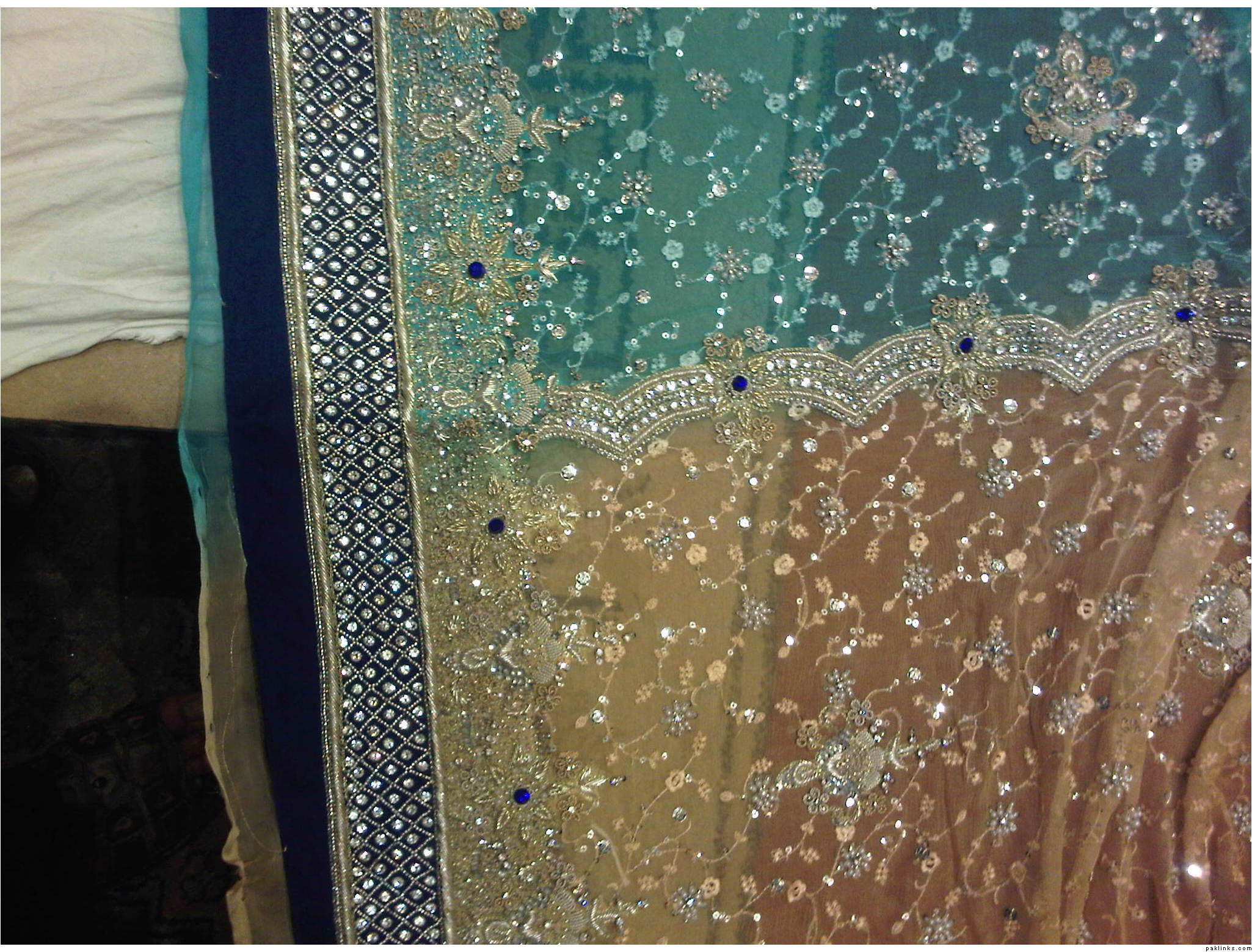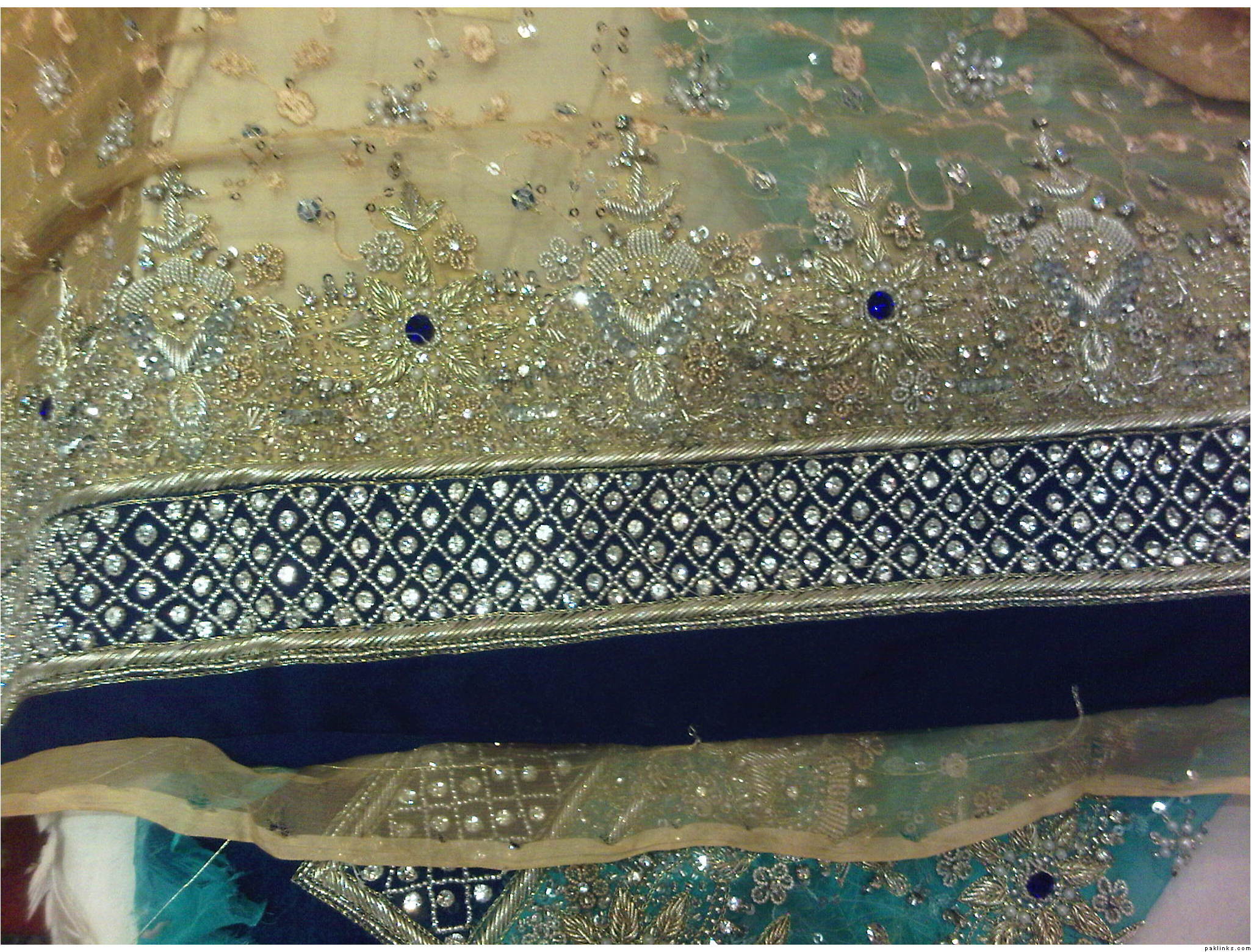 The Dress is Beige / ferozi … Two shaded with nice kaam , and blue diamonds on it , the border is lovely. ( Blue with silver kaam )