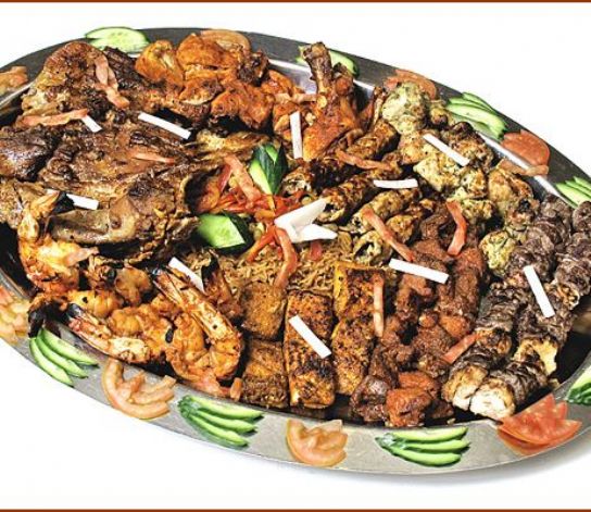 Cuisine, barbecue platter with naans/parathas (flown in from Bundu Khan’s):
