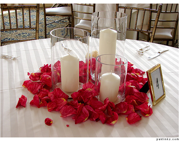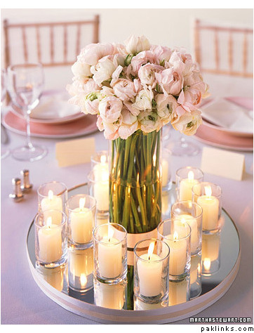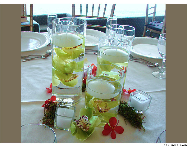two examples of doing lovely candle centerpieces… i like how they’ve used a lot of rose petals to make it seem more substantial. i could also see this working with mini dendrobium orchids scattered around or tucked in here and there in a contrasting colour like in the picture below.