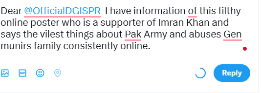 It makes me giggle that a perverted uncle working as a mechanic in a bike shop in Karachi has the audacity to make far-fetched claims like “I had my boys attack the army”. But what really got to me was his plans to physically assault women of political figures of the country in which he resides. “One day my boys will drag women of generals by their hair” comment had me shudder to my core. So utterly disgusting that animals like him bring women and children into their hateful comments. This is exactly what is wrong with society- nobody cares as long as its someone else’s daughter and wife. It baffles me how people sitting behind a screen assume that there are no consenquences for typing sheer filth. If you can, please do report him and follow up on it.
