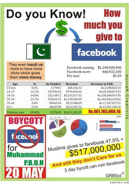 According to reports Facebook got 2359620 visits from Pakistan daily and this will contribute 47.5% total revenue of Facebook. It is yet to be ascertained if the whole Facebook will be banned or just a single URL will be filtered. In both the situations, step is inline with thousands of Facebook users and according to their urge of boycotting Facebook on May 20th.