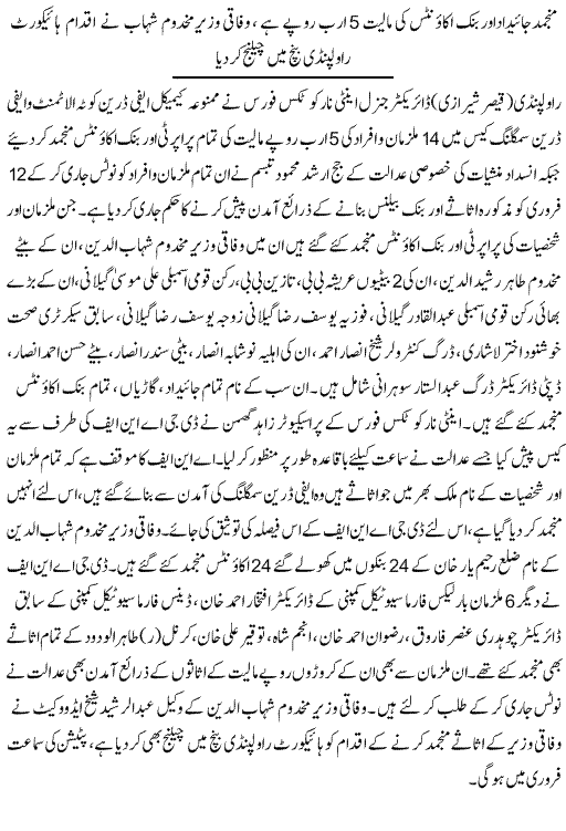 NNI adds: The ANF has frozen the accounts of Ali Musa Gilani. According to media reports, accounts of four other persons have also been frozen. They include former PM’s wife, daughter and Makhdoom Shahabuddin.