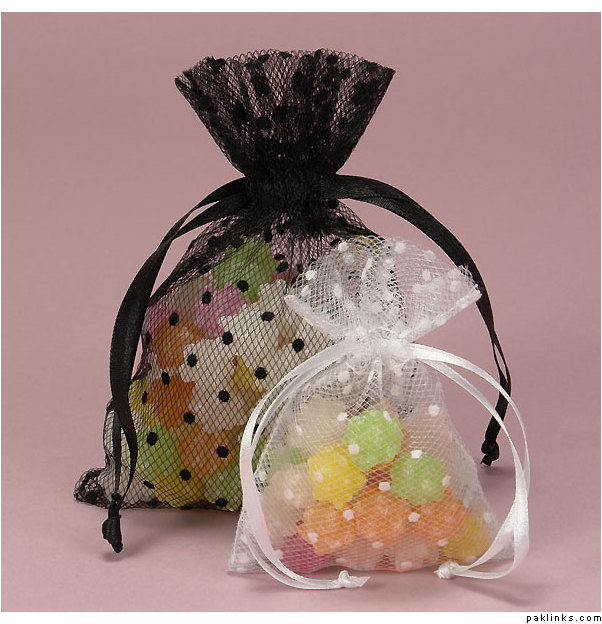 Small organza favor bags (also called pouches or sachet bags) would be the cheapest solution for bidh distribution whether in USA, UK or Pakistan. They come in multitude of colours, fabric (organza, net, velvet), design (polka dots, stripes, stars, glitter) and tie ribbons/drawstrings. I think many guppans living abroad found organza bags on Ebay. Those living in Pakistan can find them at any store that caters for birthday and mehndi decorations. Those are dirt cheap and you can fill them up with amazing variety of things. They also sell pre-filled pouches, so you just have to buy those and distribute them in decorated trays and baskets.