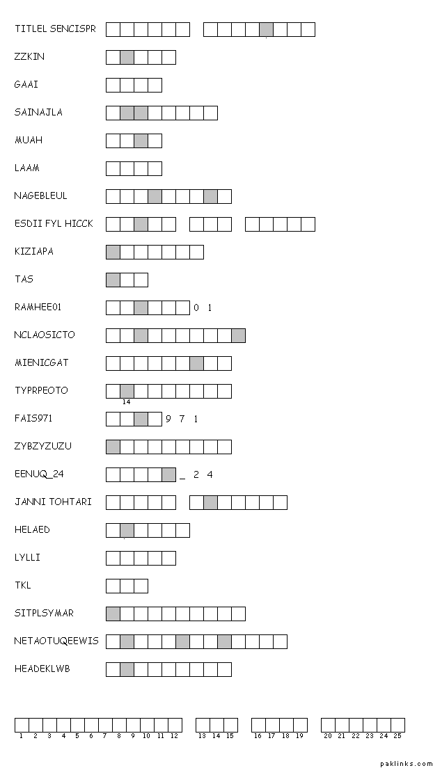 In this game, all you have to do is to writte the name in correct sequence in the fill in blank areas " _ " given against the scrambled words. The final phrase is made up of letters from the clue words which you input in those blanks given against the each scrambled words. Lets see if our Participants can solve this Either you download the image [puzzle game] than upload it after solving or fill in the blanks and post the answer here [in text].