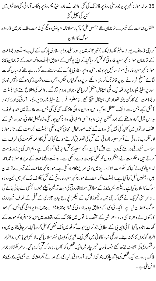 The spokesperson for the ASWJ, Maulana Akbar Saeed Farooqi, was injured in a gun-firing incident near Safari Park in Karachi’s Gulshan-i-Iqbal area.