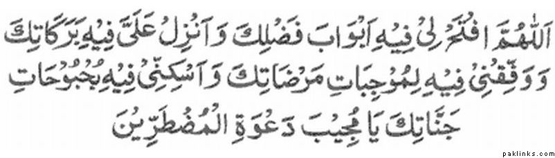 O Allah, on this day, open for me the doors of Your Grace, send down on me its blessings, help me towards the causes of Your mercy, and give me a place in the comforts of Paradise, O the one who answers the call of the distressed.*