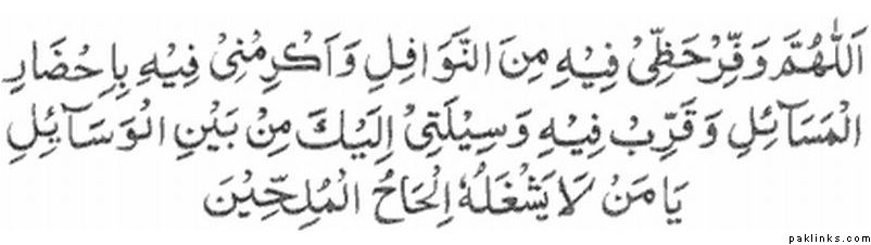 O Allah, on this day, grant me a share in its nawafil (recommended prayers), honor me by attending to my problems, make closer the means to approach You, from all the means, O One who is not preoccupied by the requests of the beseechers.