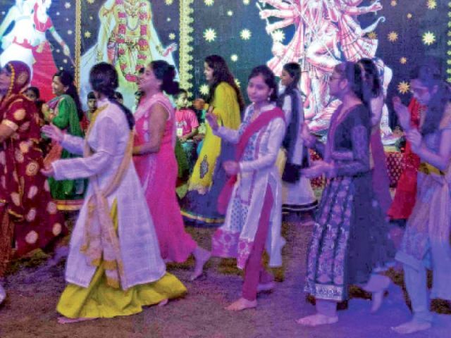 Members of the Hindu community partake in the traditional ‘dandiya’ dance on the eve of dussehra, which marks the end of Navratri, at the Swami Narayan Mandir on Tuesday night.