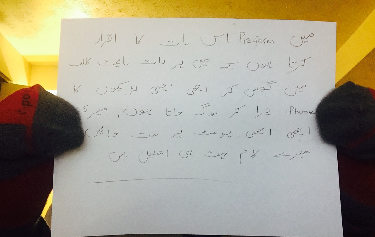 "Mai Pisiform, iss bat ka iqrar karta hun ky mai harr raat night club mai ghuss kar achi achi larkiun ka iPhone chura kar bhag jata hun, mairi achi achi posts par matt jayen, mairy kam Bohat he ashleel hain… "