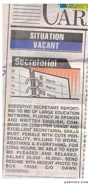 why dont they introduce an 'ESCORT' section in the classified.. this is what they are requiring right.... .anything and everything to please explains a lot..........but she wont be allowed to speak about it as like Monika Lewinsky did about his boss :D...