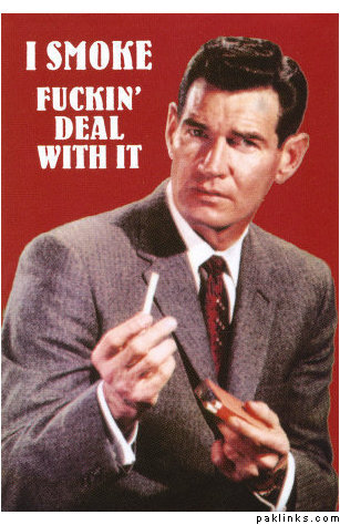I think smoking is an utterly disgusting habit. Someone needed a ride today; right when he got in he pops out a ciggy and lights it up in MY car without even asking me if I was alright with it. I just made up something and told him I’m allergic to cigarette smoke and all he did was roll down the window so that the fumes go out INSTEAD of getting rid of it. SHESH! So all you smokers out there, I hope you guys have the decency to ask before you light it up, if you’re in someones presence or their property. Its not your pyooo di gaaari where you can start smoking as you please! I dont like smoking, so I dont want any passive smoking either.