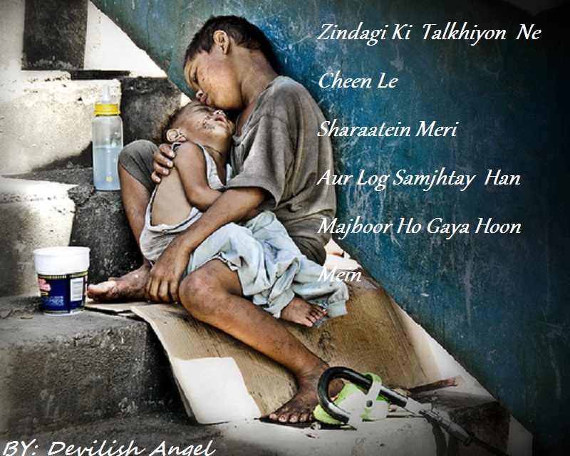 i m not good in poetry, but still i interpreted this sher like this: harsh n bitter realities of life have taken away our childhoon, beacause with sharatein the first word tht comes into my mind is kids , so here is my entry:
