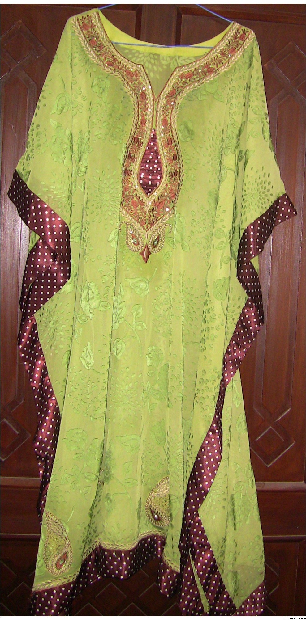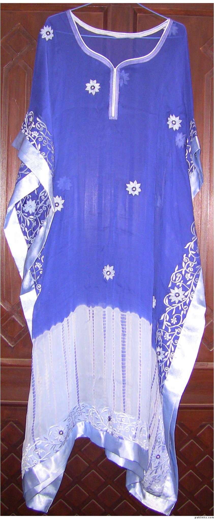 This is a kaftan made in pure chiffon with embroidery all over the borders. The trousers are made of raw silk and slip will be made in silk as well. Its price is 8000 Rs. Dopatta can also be included if u want.