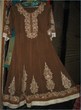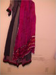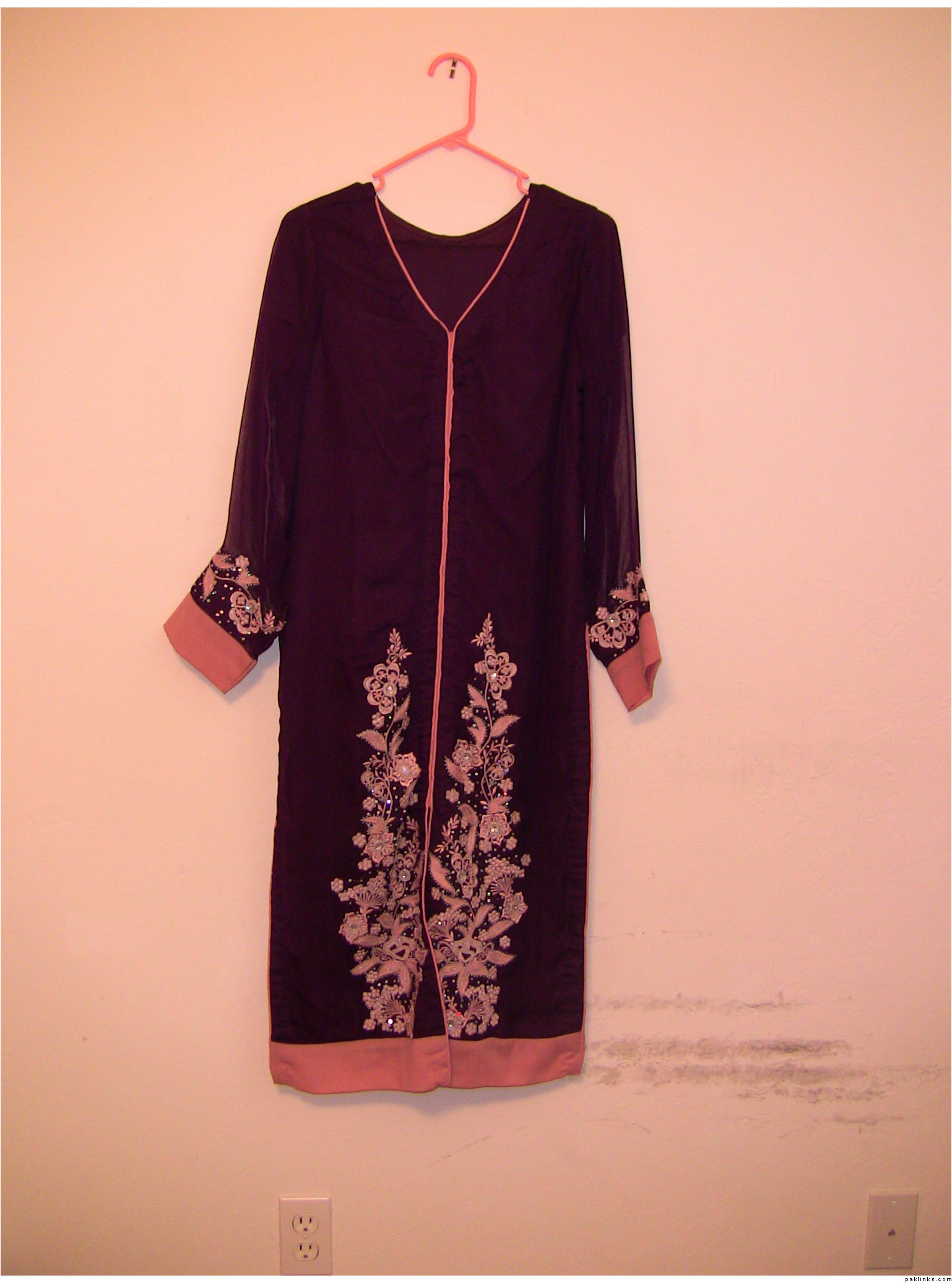pueple chiffon suit stitched in front open style with light tea pink embroidery on the daaman . matching pattis stitched on the daamana nd sleeves and also on the dopatta.