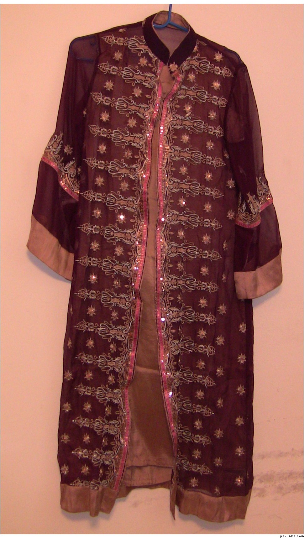 this is a deep purple gown all worked on in sequins and thread. the unders hirt is skin brown color and the trouser is the same way. Both made in pure raw silk. the dopatta is pure chiffon and has embroidery spray like the gown.