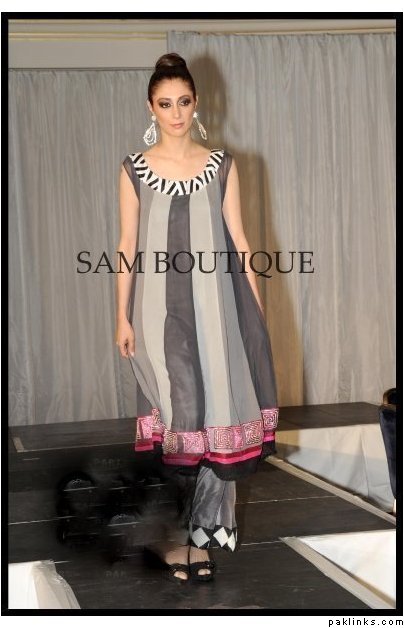 Pure chiffon panels dress made in differenet shades of gray with lovely beads work on the daman along with lace details. the dopatta is shaded pink with gotta on the sides. trousers are made of pure raw silk.