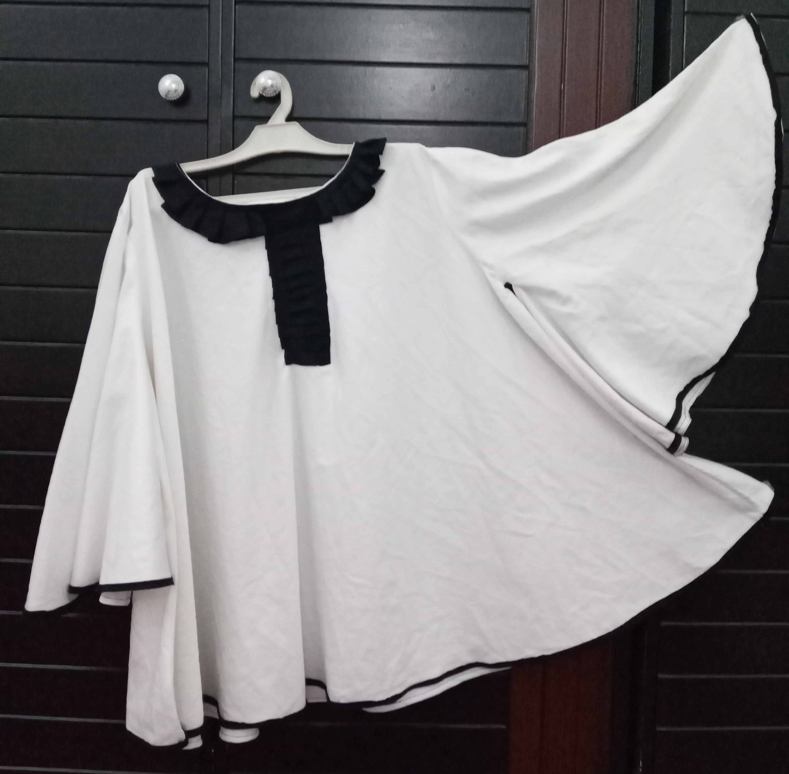 Description: White Butterfly Top With Black Ruffled Neck Design