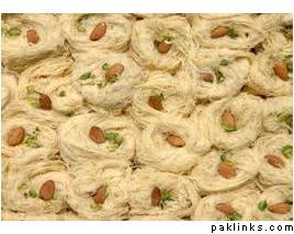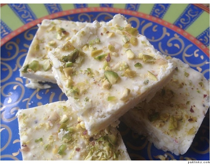 Sheer Payra – A fudge-like sweet made from milk and topped with cardamom and pistachios.