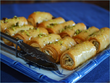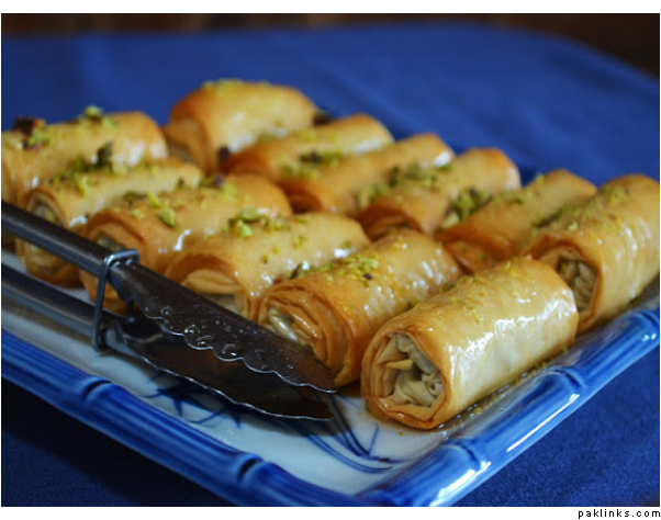 Asabia-el-aroos (“brides’ fingers") – Thin fingers made from crisp phyllo pastry which are stuffed with nuts and sugar (and sometimes cream) and are glazed, baked, and dipped in orange syrup before serving.