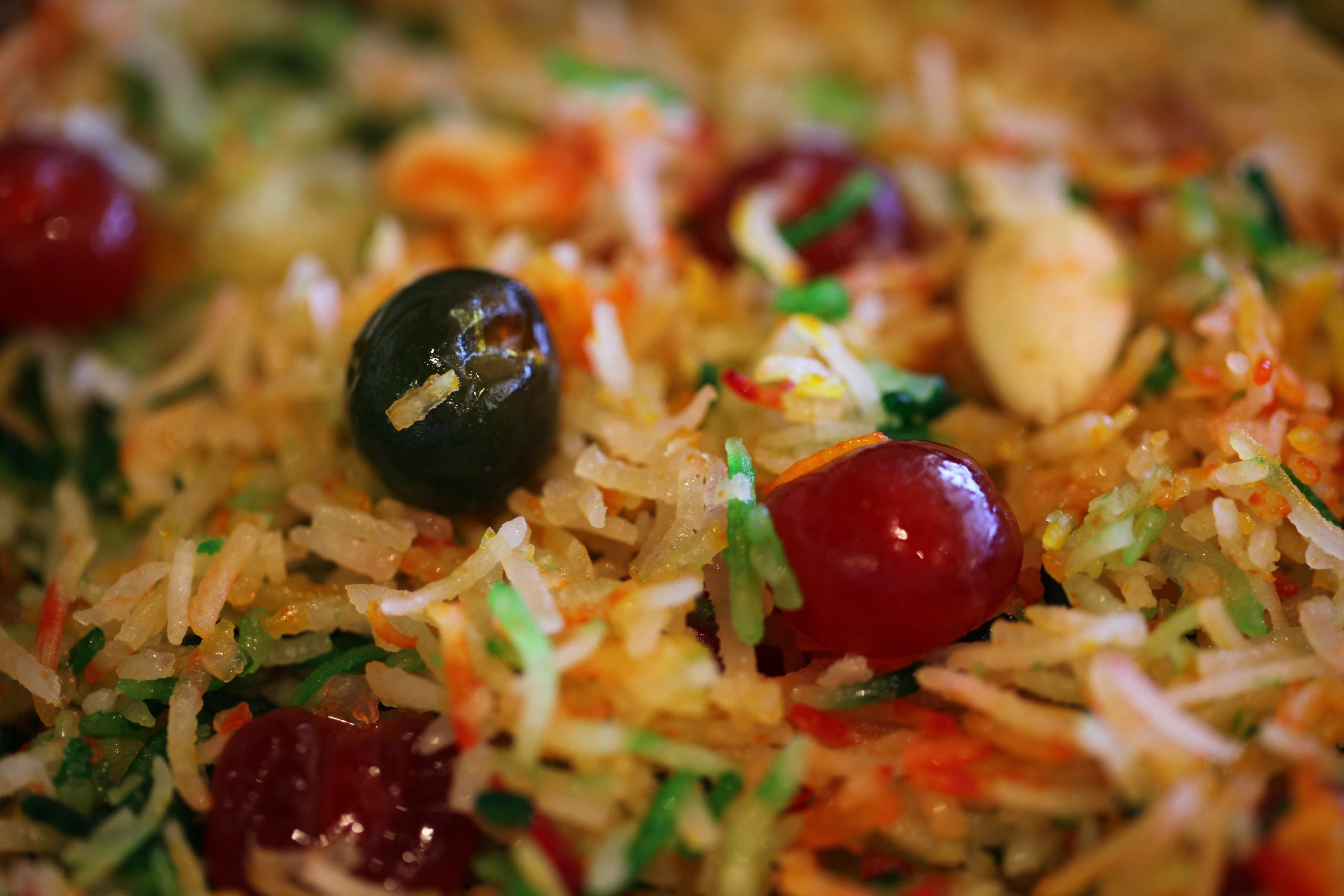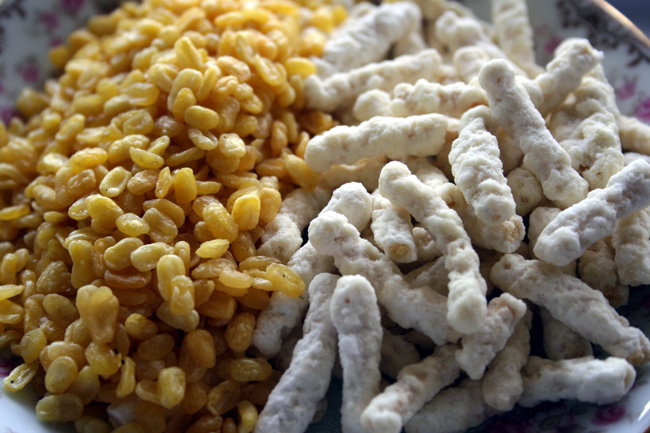 Rasaaval [rice cooked in sugarcane syrup topped, contains resins, coconut tidbits, and chironjii]…it’s eaten with milk, simmering overnight on low heat (on coal bed)] and malaaii
