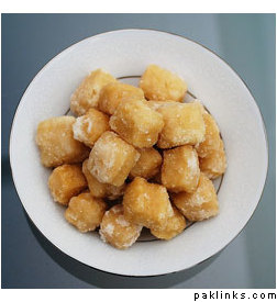 yes. then dipped in sugar syrup which is allowed to crystallize on it's surface. it's like dried icing on thick namakpaara.