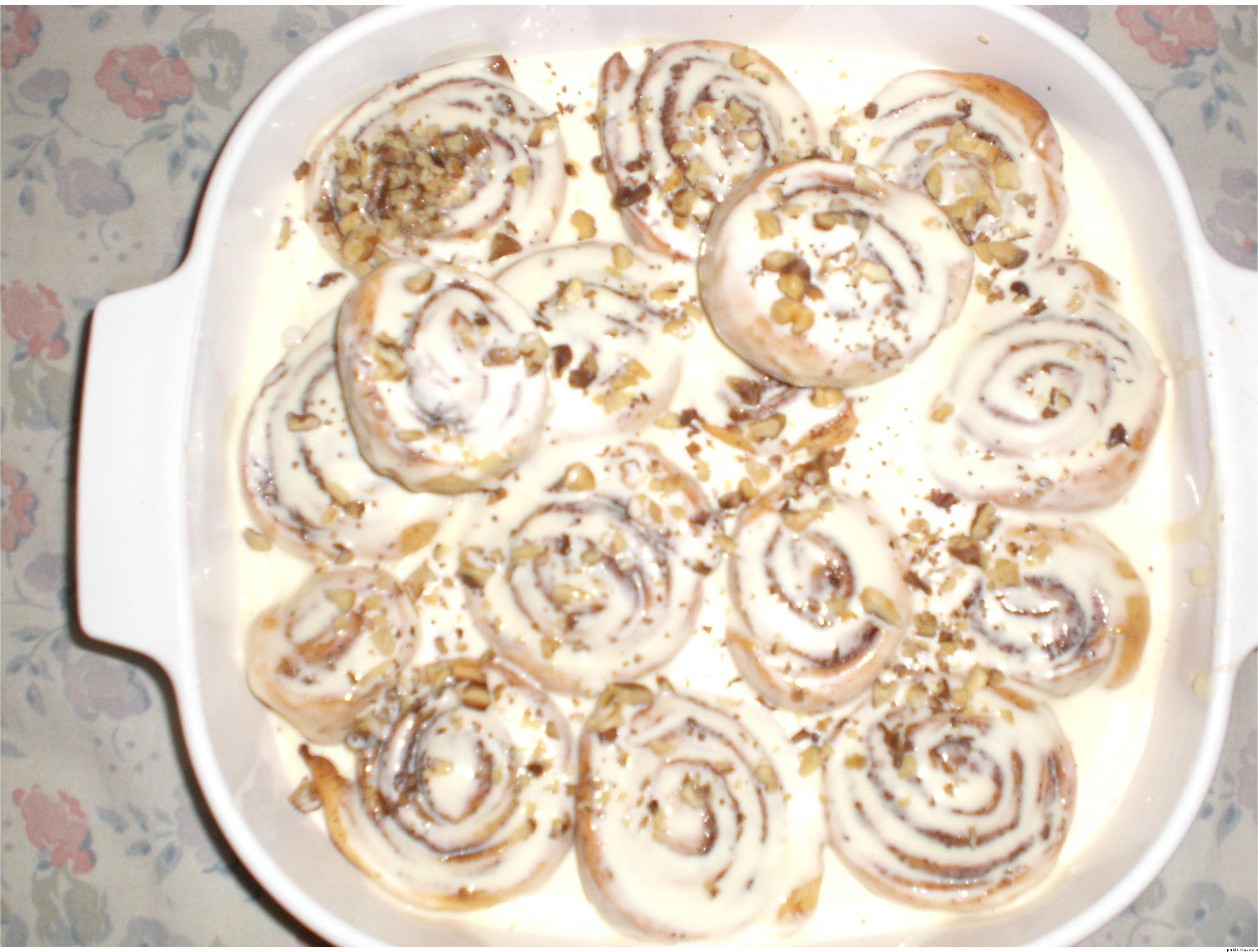 Take 2 ¼ cup plain flour + 1 tsp yeast. Knead the dough with the help of above blended mixture. Keep the dough in a warm place till it raises a bit approx 20 mins. With the help of flour and rolling pin, roll the dough to make a big chapatti. It shouldn’t be too thick or thin. Sprinkle approx 1 cup brown sugar all over the rolled chapatti and then sprinkle generous amount of cinnamon powder approx half cup. Roll it gradually and carefully just like a Swiss roll and then cut the roll into 1 inch pieces and then bake it on a greased baking tray until the buns become light brown. Make sure they don’t turn too dark otherwise it’ll harden.