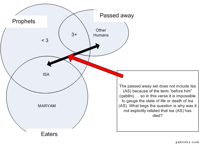 Please read the ayah with open mind. There are 2 parts to the verse relating to Jesus a.s. One part is combining Isa a.s with those prophets who have passed away before Him. You're telling me that in that verse Jesus a.s is said to be like other prophets because they ate food. That is very wrong for you to interpret it this way. The eating part is ONLY and ONLY said about Jesus AS and His Mother. The verse is not like 'prophets before him used to eat too', or anything like that. The REASON of Allah using the example of EATING is that Jesus a.s ate, and God does not eat.. therefore Jesus a.s cannot be considered as God. Since He (as) 'ate' and was like other prophets, therefore, Jesus a.s passed away like other prophets have passed away who used to eat. Jesus a.s is like other prophets in passing away !