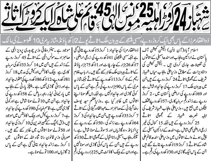 Nusrat Shahbaz wife of Mian Shahbaz Sharif owns assets valuing Rs 250 million including 15 kanal land. PPP leader Qasim Zia owns property worth Rs 9 million, cash Rs 70 million and bank accounts.