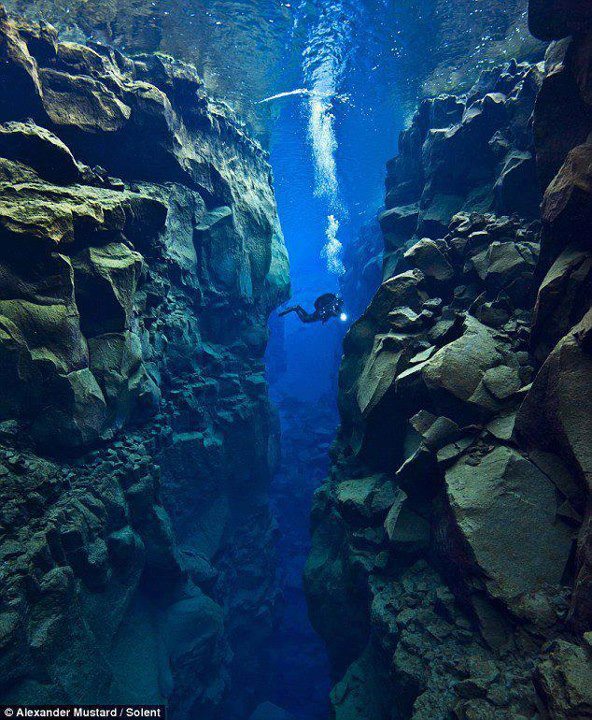 The gap between Europe and the United States is widening - by one inch a year. This image shows the vast gap between the two tectonic plates, as seen by a British scuba diver, Alex Mustard, 36,dived 80 feet into the crevice between North America and Eurasia to reveal the stunning landscape.The area - near Iceland - is riddled with faults, valleys, volcanoes and hot springs, caused by the plates pulling apart at about 1 inch per year.