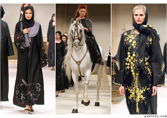 Last week, French President Nicolas Sarkozy said full-body veils, like burkas some Muslim women wear over their clothes, are “not welcome” in France. Four days later, the George V Hotel in Paris hosted a fashion show consisting entirely of designer abayas. John Galliano designed the abaya worn by the red-haired model who opened the show by riding down the runway on a white horse. Twenty models followed wearing abayas by Nina Ricci, Blumarine, and Alberta Ferretti, among others. The first batch of abayas, ranging from $5,500 to $11,150, will be given as gifts to Saks Fifth Avenue’s most faithful Saudi clients. Ready-to-wear versions of the robes will hit the sales floor in Jeddah and Riyadh in Saudi Arabia in September, retailing for around $2,500.