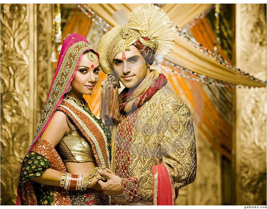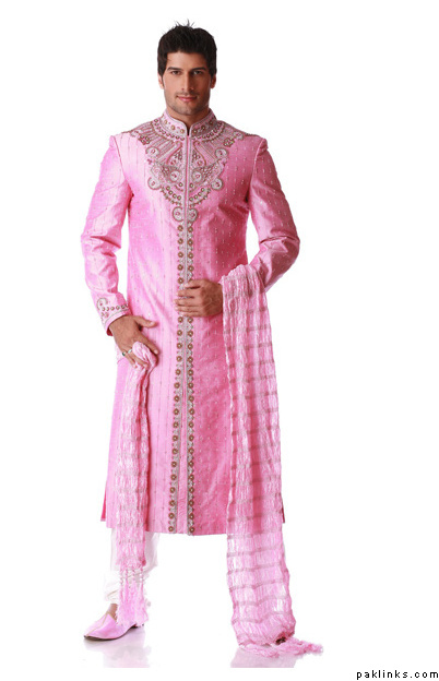 With Indians, any kind of groomswear goes. The grooms are just as decked out as brides are, i.e, necklaces, mehndi on hands, jewels, colorful sherwanis, etc etc.