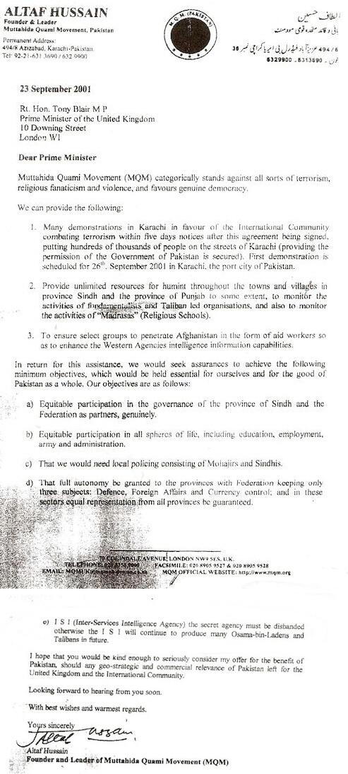 According to information released under the Freedom of Information Act, the letter was dated 23 September 2001, signed by Altaf Hussain and delivered to 10 Downing Street by Nirj Deva, who is currently a Member of the European Parliament (MEP) for the Southeast of England.