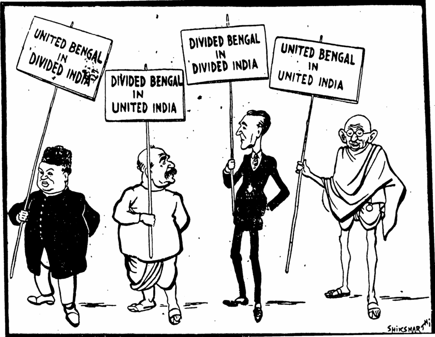 A cartoon in the Amrita Bazar Patrika published in May 1947, graphically captured the doubts and confusion in people’s minds.5 Titled, ‘Who is Right?’ it showed four key public and political figures, H. S. Suhrawardy, Shyamaprasad Mookerjee (the leader of the Hindu Mahasabha), M. A. Jinnah and M. K. Gandhi each with a placard with their supposed propositions. Thus Suhrawardy holds ‘United Bengal in Divided India’, Mookerjee ‘Divided Bengal in United India’, Jinnah ‘Divided Bengal in Divided India’ and Gandhi holds up a sign with ‘United Bengal in United India’ (Cartoon Source - journals.cambridge.org. Attribution - Figure 1. ‘Who Is Right?’Source: Cartoon in the Hindustan Standard, 17 May 1947, 5.)