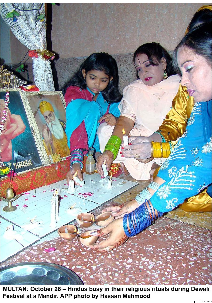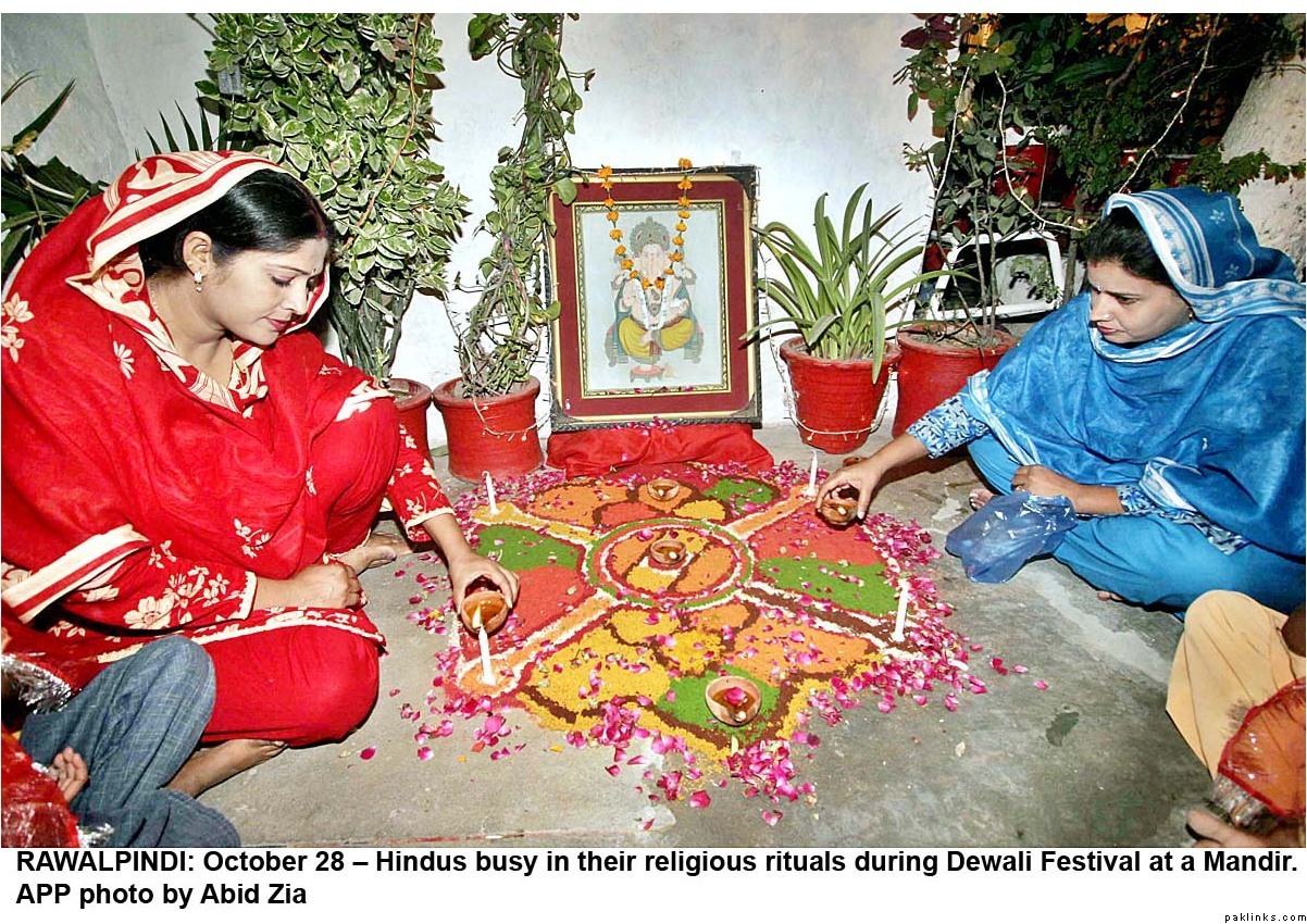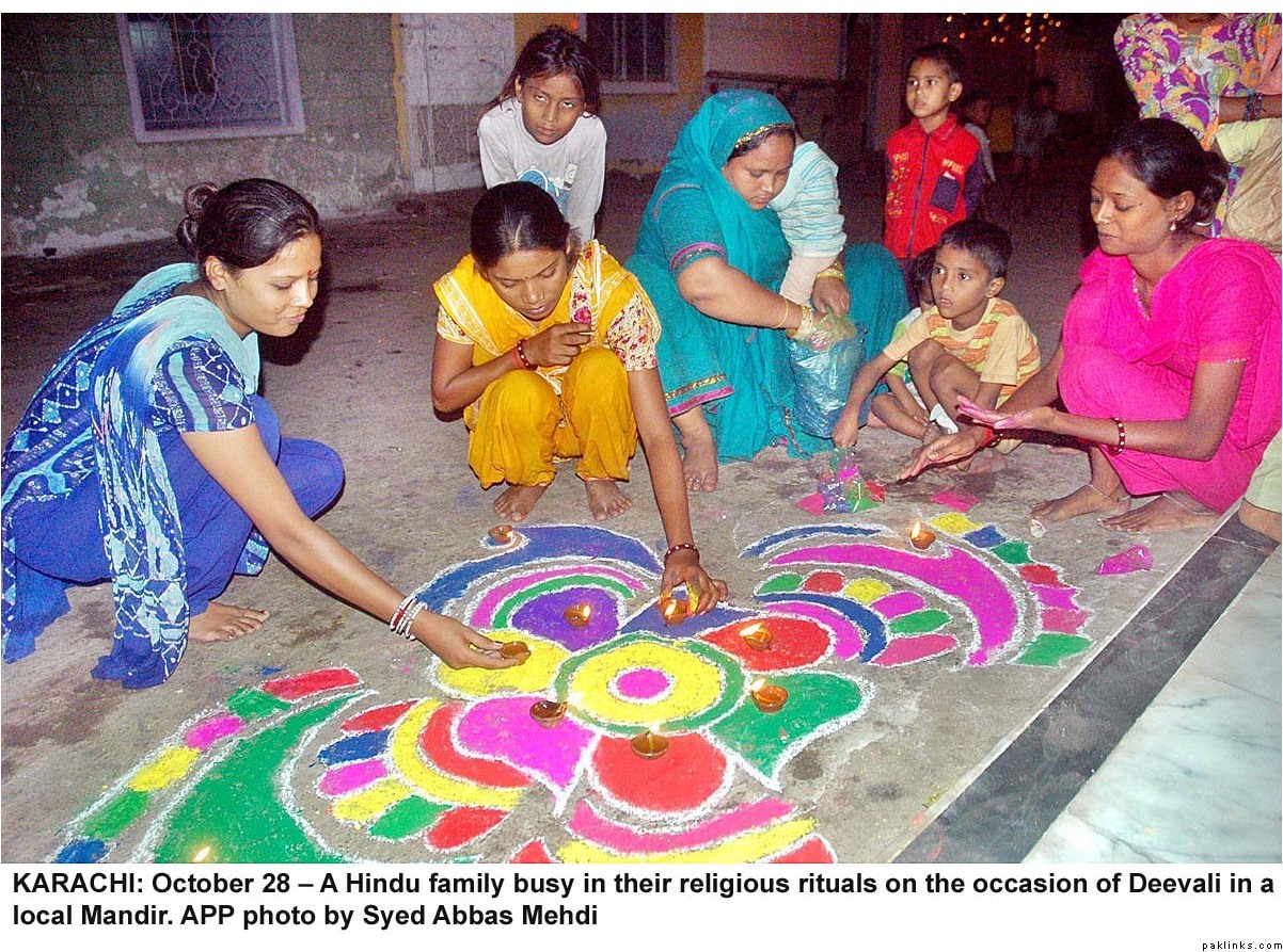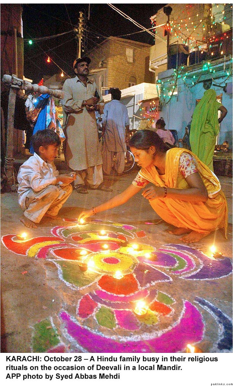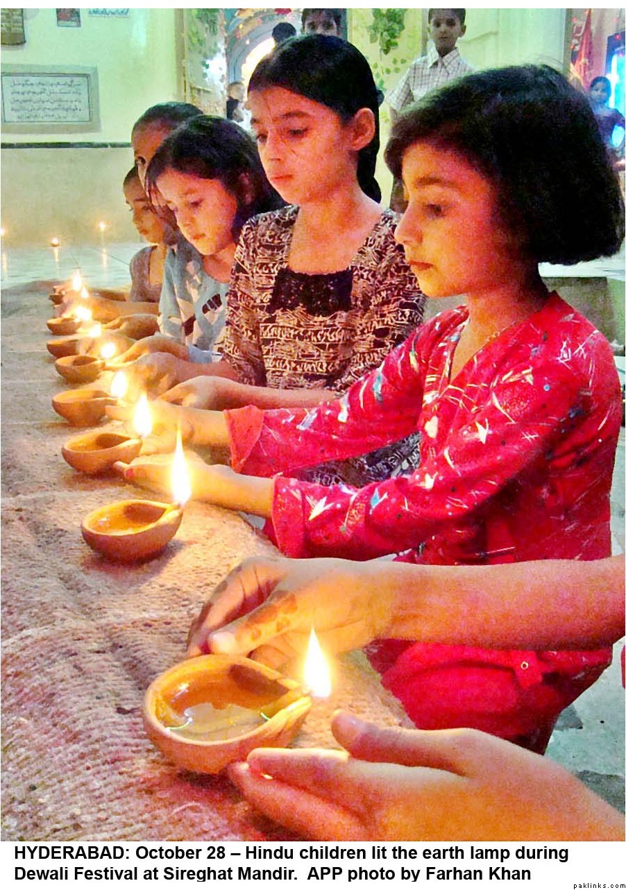 Diwali was celeberated with religious fervor all across Pakistan. Hindus lit lamps and prayed in many mandirs all over the country. Hindus make up 1.5%(approx. 2.5 million/official figures) of the Pakistani population(most of them live in Sind) and enjoy full religious freedom of expression. For the last few years Pakistani minorities are better represented in the main stream and among the Pakistani media, thanks to the government efforts. Pakistani Hindus can participate in joint electorate and have their seperate desiganted seats in parliament to elect their own leaders.