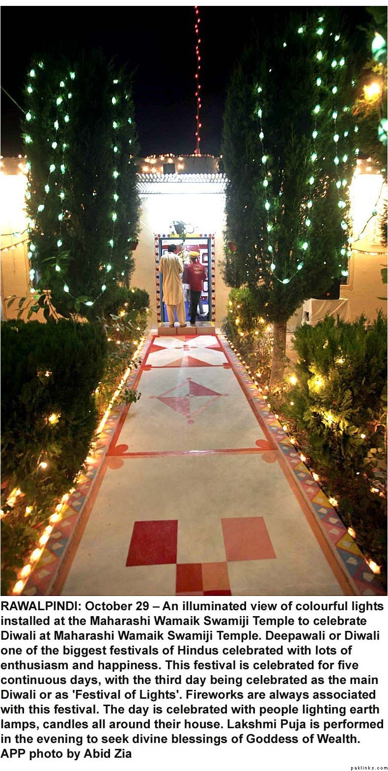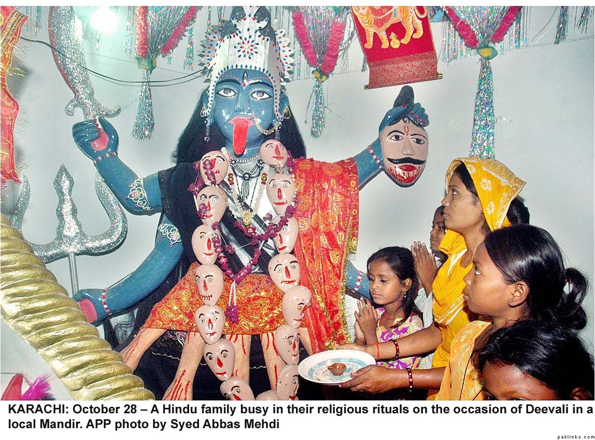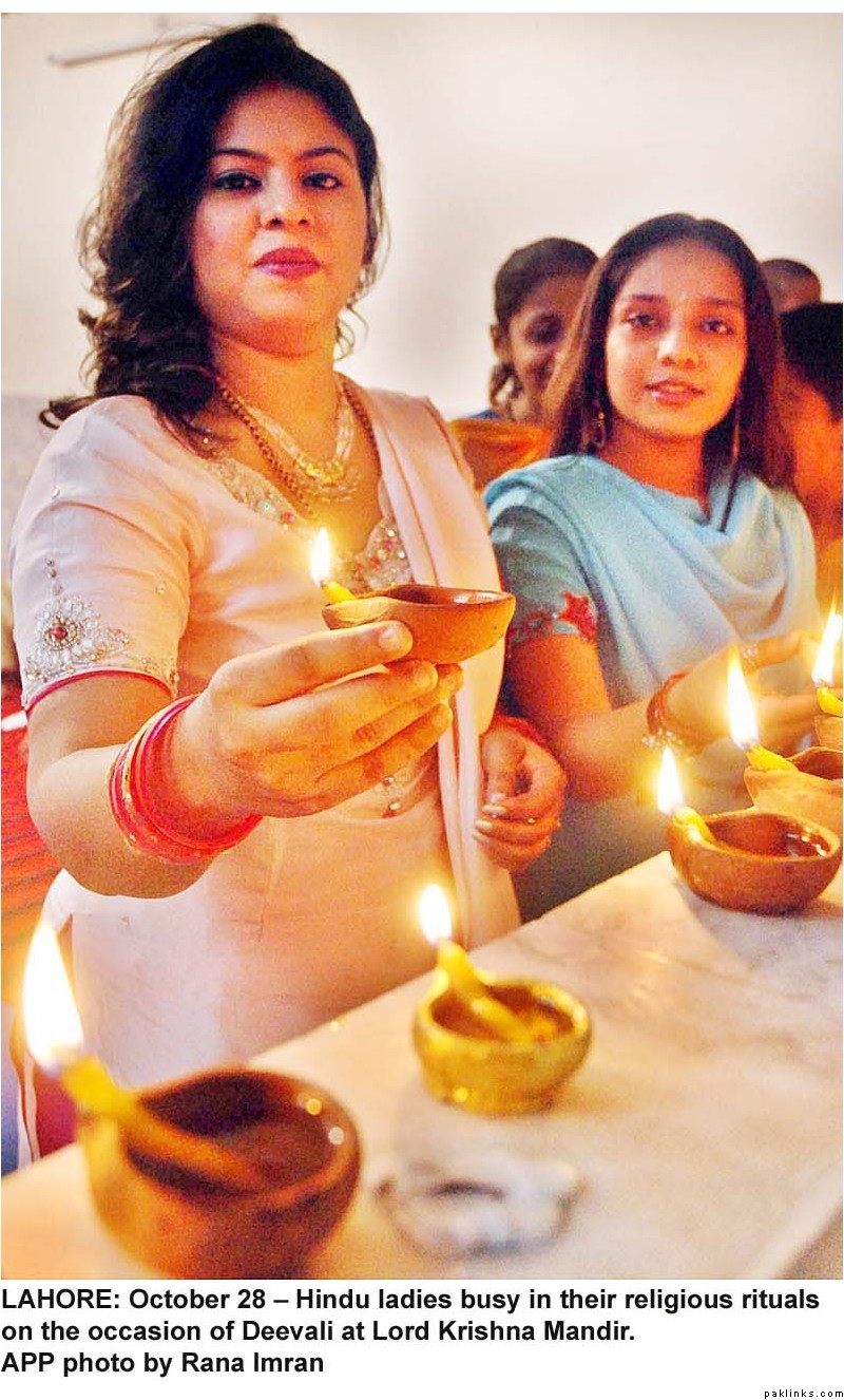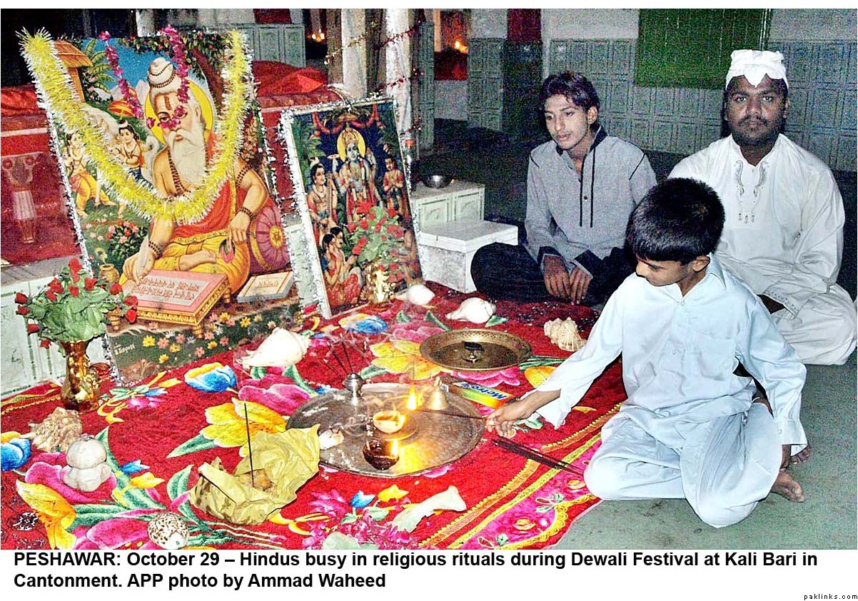 Diwali was celeberated with religious fervor all across Pakistan. Hindus lit lamps and prayed in many mandirs all over the country. Hindus make up 1.5%(approx. 2.5 million/official figures) of the Pakistani population(most of them live in Sind) and enjoy full religious freedom of expression. For the last few years Pakistani minorities are better represented in the main stream and among the Pakistani media, thanks to the government efforts. Pakistani Hindus can participate in joint electorate and have their seperate desiganted seats in parliament to elect their own leaders.