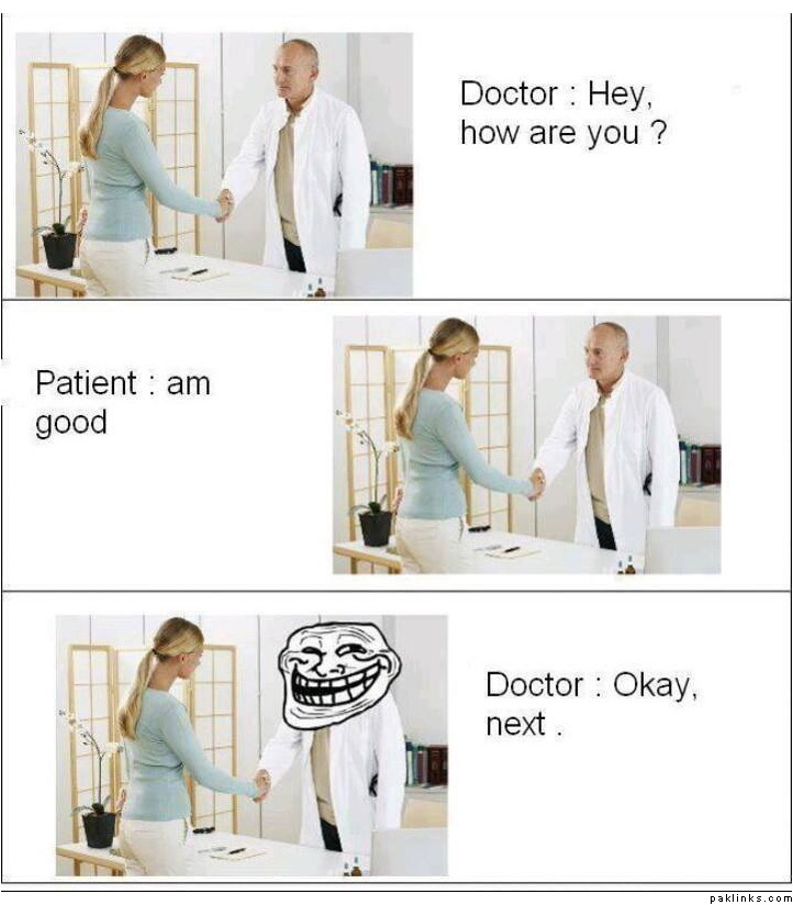 yeh to sabhii ke saath hotaa haiā¦DR jab kamre meN daaKhil hotaa hai to yehii poochhtaa hai k āHow are you?āā¦ab use kia bataaye koii kaa Haal chaal achchhaa hotaa to koii kiuN aataa DR kaa chehraa dekhne! ![]()