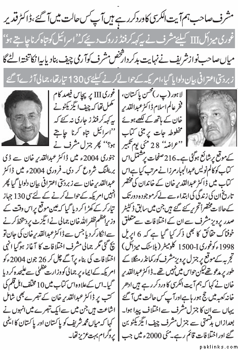 In this book he shared that Gen. Musharaf stopped the funding of Ghouri III by saying “Do you want to destory Israel?” Many more interesting incidents as discussed in this report.
