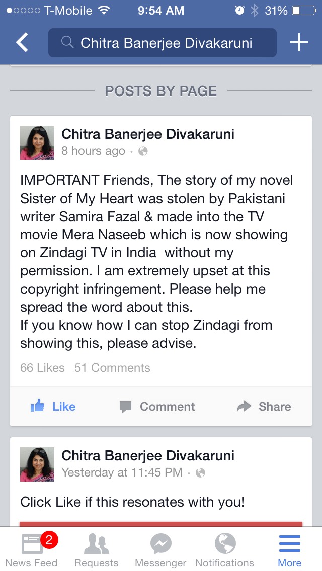 Writer Chitra Banerjee Divakurni took to her Facebook page claiming that the story from her novel “Sister of My Heart” was allegedly stolen by Pakistani writer Samira Fazal and made into “Mera Naseeb”.