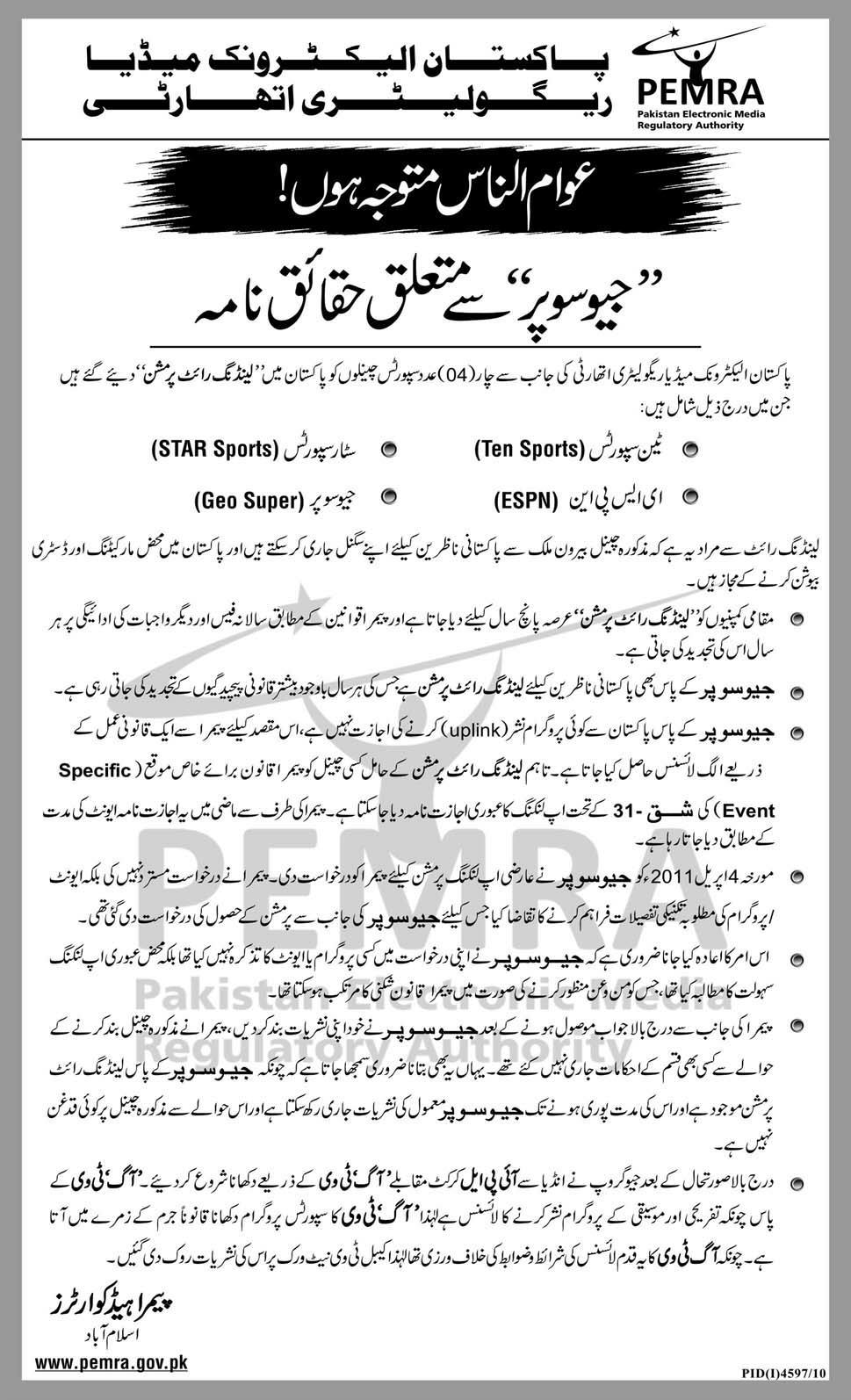 The Link below has PEMRA’s official statement regarding the matter of AAG tv and Geo Super