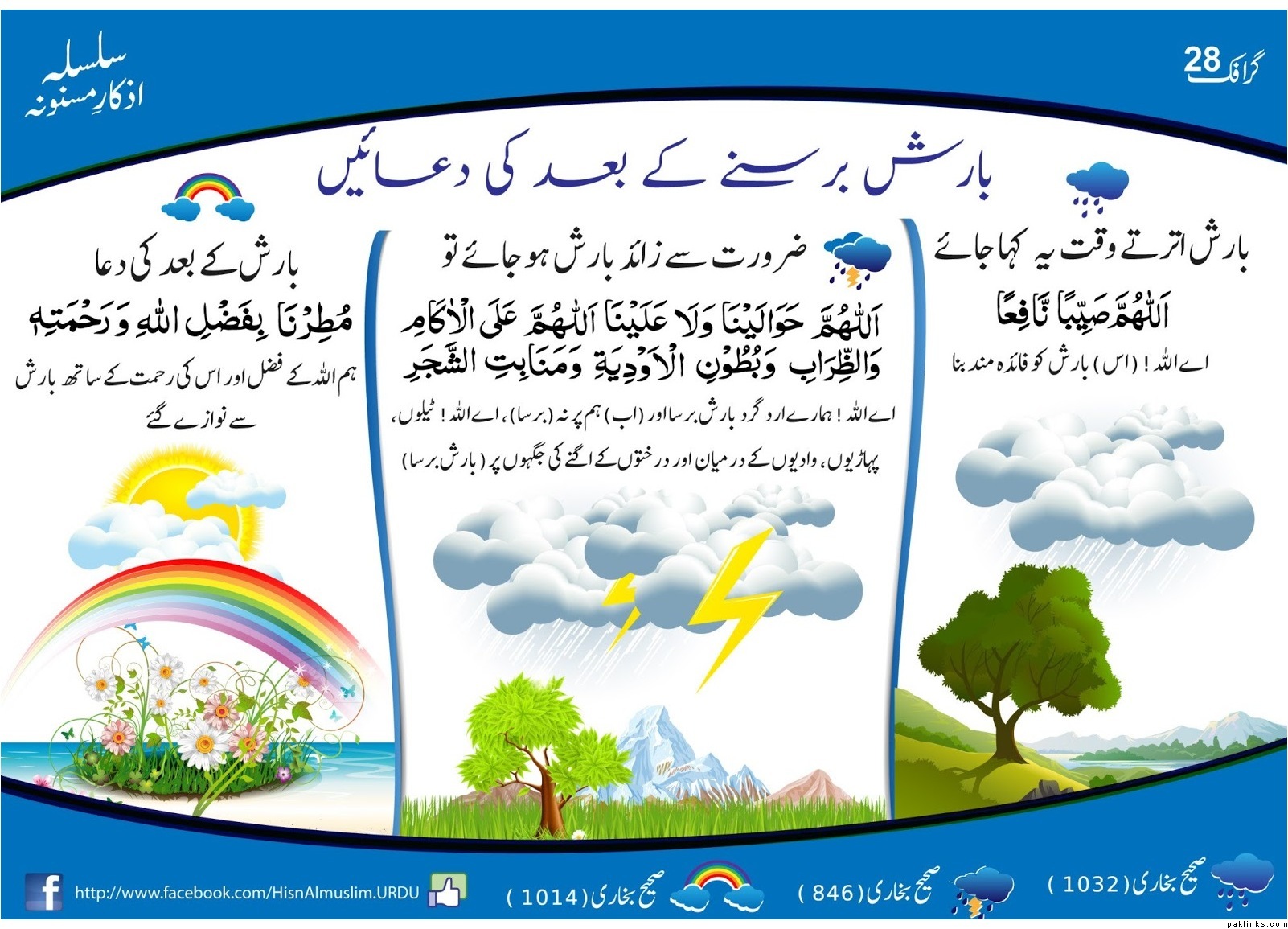 Prophet (peace and blessings of Allaah be upon him): “There are two which will not be rejected: du’aa’ at the time of the call (to prayer) and when it is raining.” Narrated by Abu Dawood and classed as saheeh by al-Albaani in *Saheeh al-Jaami’ (3078). *