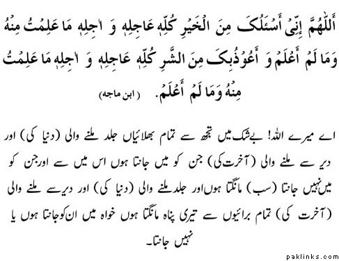 O Allah! Indeed I ask You of every kind of good, the one to be hastened (of the world) and the one to be delayed (of the hereafter) from that which I know and do not know; and I seek refuge in You from every kind of evil the one to be hastened (of the world) and the one to be delayed (of the hereafter) from that which I know and do not know.