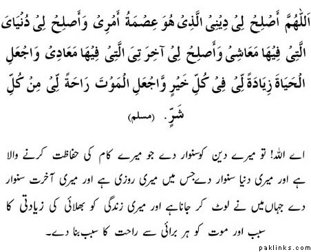 O Allah! Rectify for me my Deen which is a means of guarding my matters and the world which is a means of my livelihood, and make good my hereafter in which is my returning, and make my life a means of abundance of good and my death a means of comfort and peace free of all bad.